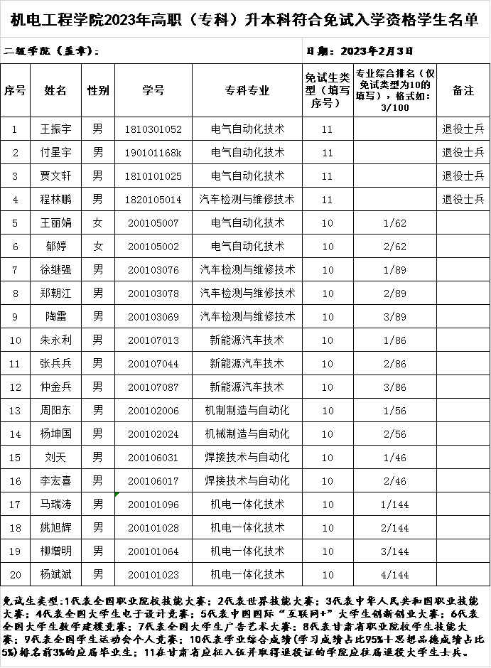 根据《2023年甘肃省普通高等学校高职(专科)升本科考试招生工作方案》(甘教发〔2022〕9号)和《2023年甘肃省普通高校高职(专科)升本科免试生招生工作实施方案》(甘招委发〔2023〕1号)等文件精神,结合《酒泉职业技术学院2023年高职(专科)升本科考试免试入学考生资格审定办法》,学院遵循公平、公正、公开的原则,经学生本人申请、二级学院审查,确定王振宇等20名同学符合酒泉职业技术学院2023年高职(专科)升本科考试免试入学考生资格,现予以公示。