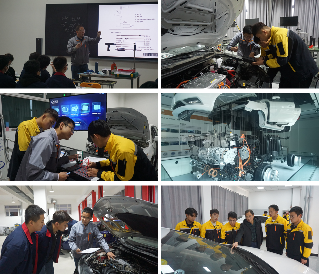 汽车维护与保养、汽车维护与保养实训、新能源汽车电工基础、新能源汽车电工基础实训、新能源汽车电力电子技术、新能源汽车电力电子实训、汽车电子控制原理与技术应用、汽车电器与辅助电子系统技术及检修、汽车电器与辅助电子系统技术及检修实训、新能源汽车底盘技术及检修、新能源汽车底盘技术及检修实训、汽车网络与电路分析、驱动电机及控制技术、动力电池管理及维护技术、新能源汽车综合性能检测、新能源汽车综合性能检测实训、新能源汽车综合故障诊断、新能源汽车综合故障诊断实训、毕业设计、轮岗实习、顶岗实习、汽车保险与理赔、质量管理与质量认证、汽车销售顾问实战、汽车服务顾问实战、汽车市场营销实务、汽修专业创业课、专业考证培训、岗前专项培训